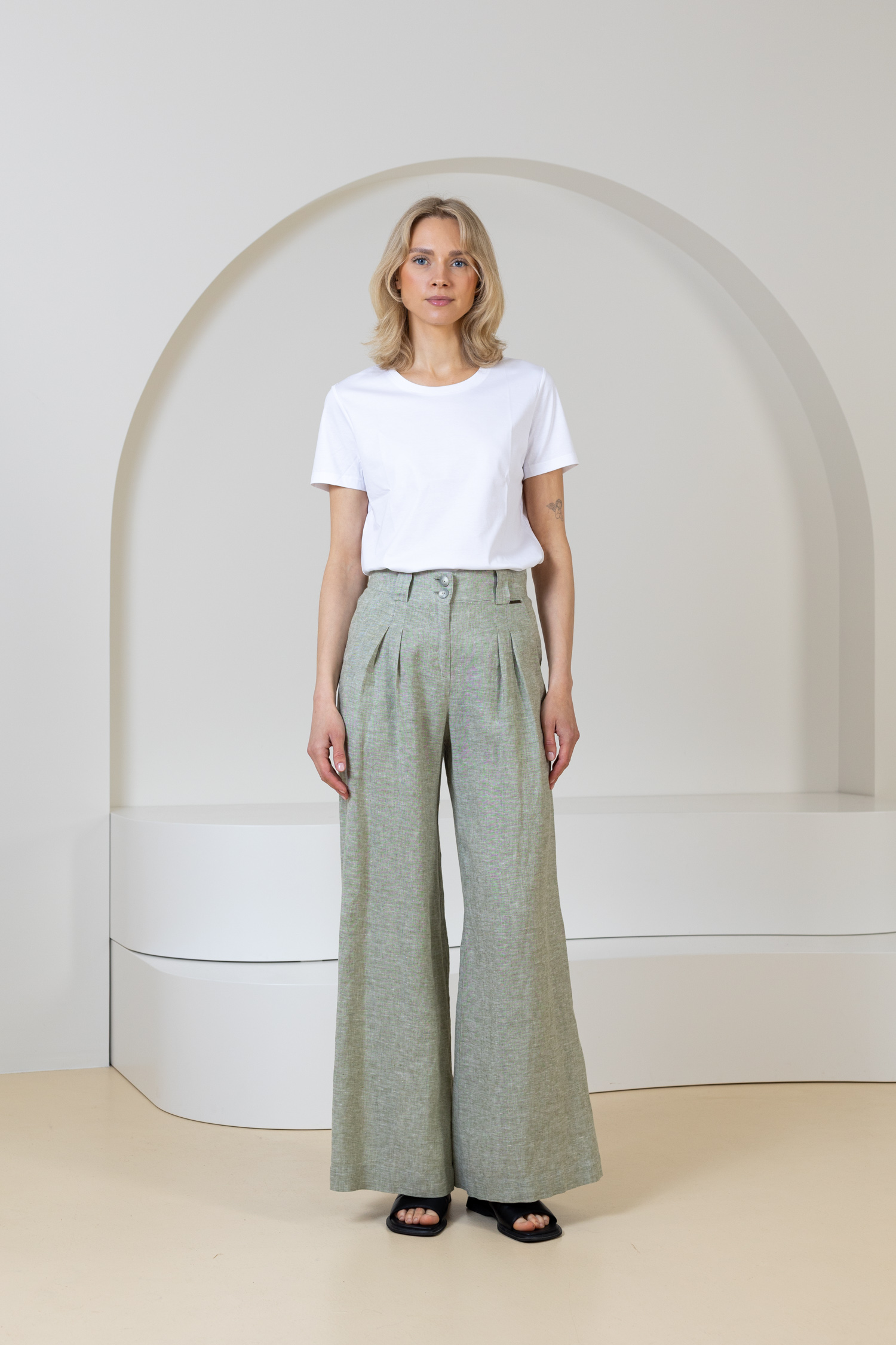 Plačios lininės kelnės su klostėmis – puikus pasirinkimas ieškančioms patogumo, stiliaus ir kokybės. Puikiai tinka tiek kasdienai, tiek atostogų deriniams.