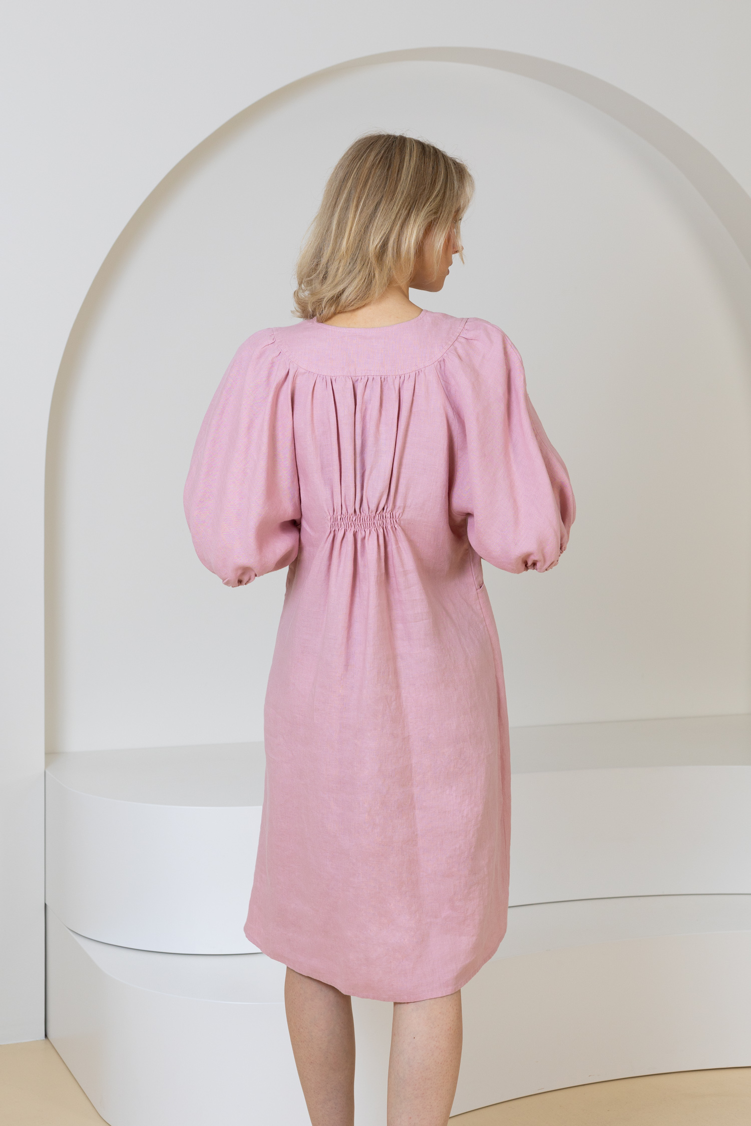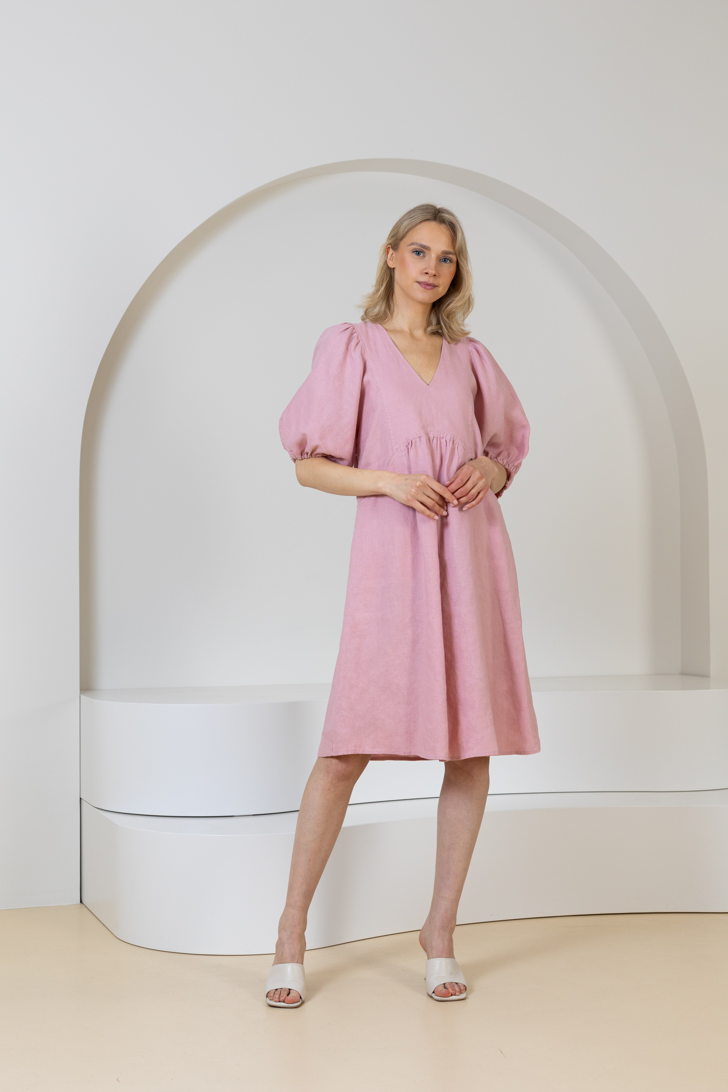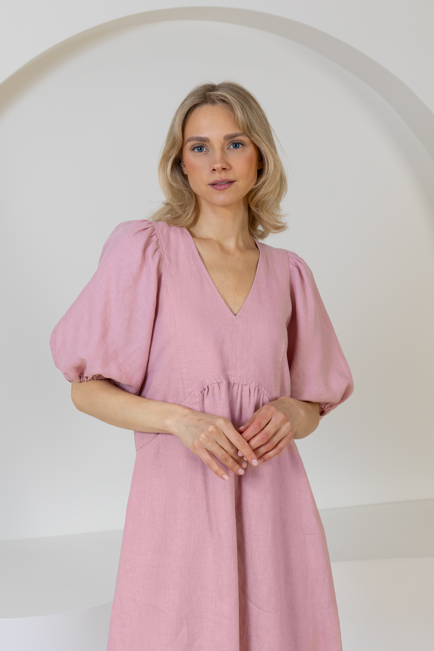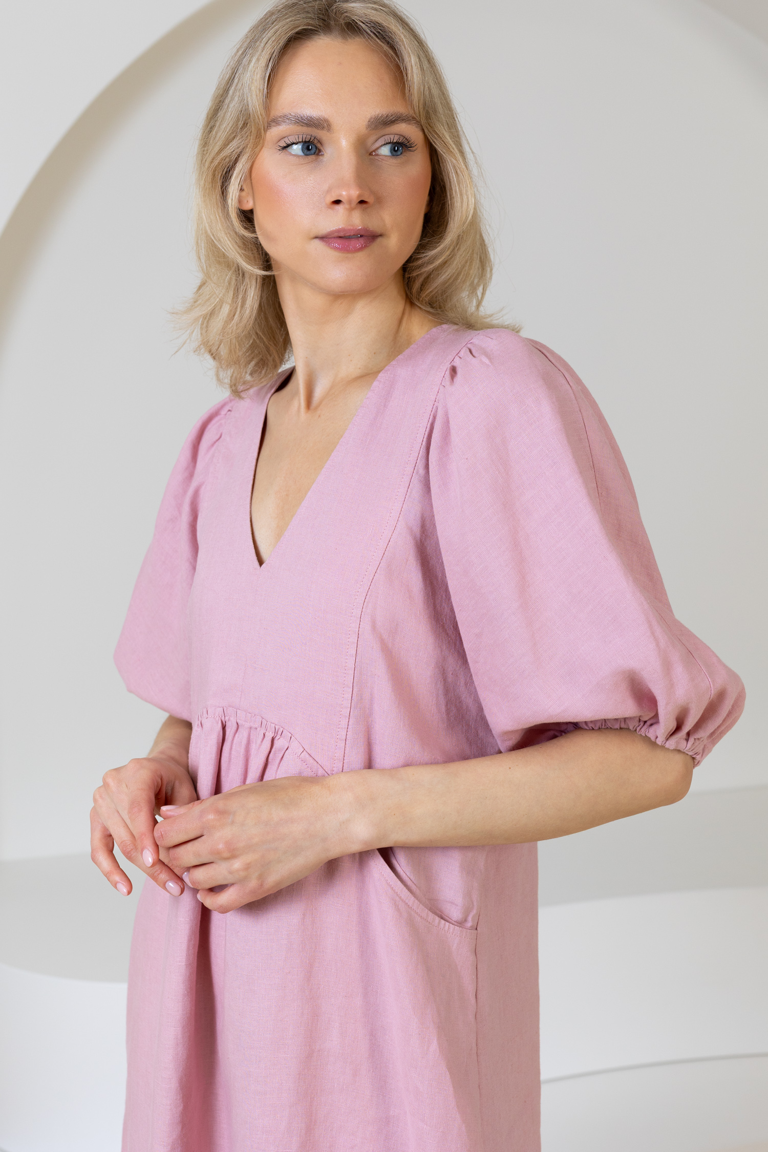 Atraskite Lietuvoje pagamintų lininių drabužių kolekciją. Šiltuoju metų laiku jums siūlome puoštis lino drabužiais bei įvertinti šio audinio privalumus. Lininė suknelė – tai investicija į komfortą, stilių ir madą iš gamtą. Tai drabužis, kuris ne tik puikiai atrodo, bet ir leidžia jaustis natūraliai bei laisvai. Atraskite žaismingą lininę suknelę su kišenėmis. Šis suknelės modelis išsiskiria pūstomis rankovėmis, V formos iškirpte ir judesių nevaržančiu modeliu. Midi ilgis sukuria elegantišką įvaizdį, o nedidelis raukinukas nugaroje suteikia išskirtinumo.